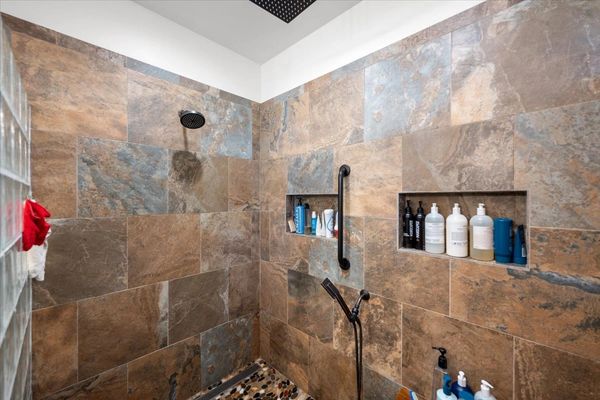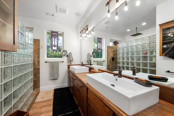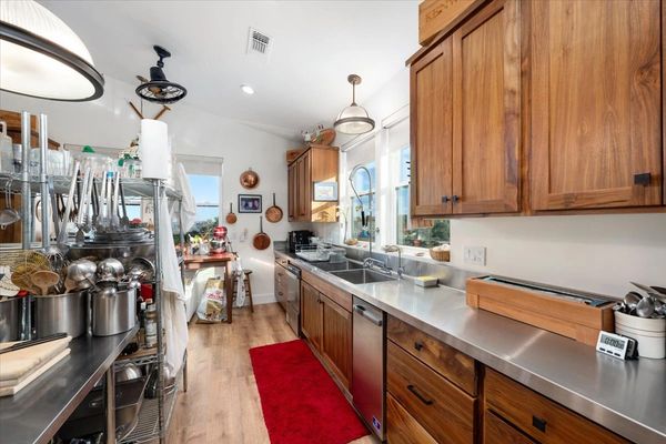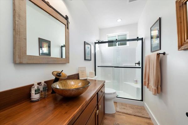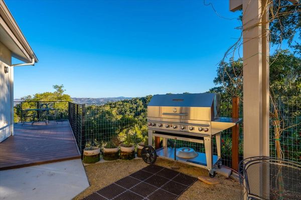 The gourmet kitchen includes a 6-burner gas range with hood and pot filler, commercial dual-door fridge and freezer, 4-minute dishwasher, stainless steel counters with integrated sinks, prep sink with disposal, and an ice maker. The dining area opens to a spacious view deck, while one of the fenced yards includes a patio for grilling and a garden with fruit trees and the other is currently used as a pet play yard. The primary suite offers deck access, a walk-in closet, and a spa-inspired bath with dual sinks, river rock shower flooring, multiple shower heads, and motion-activated lights. The large laundry room features ample storage, a quartz-topped utility sink, and outdoor access.