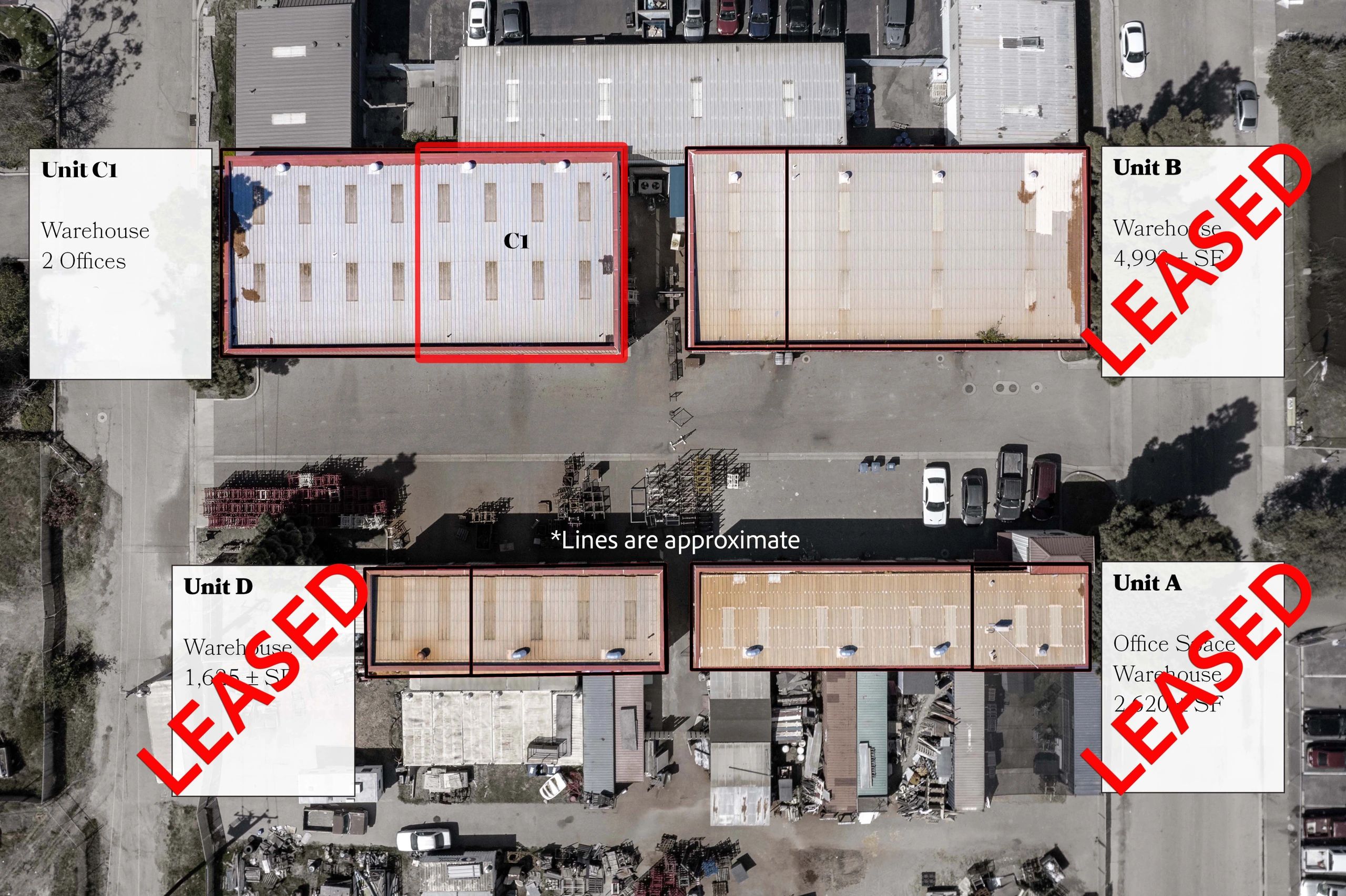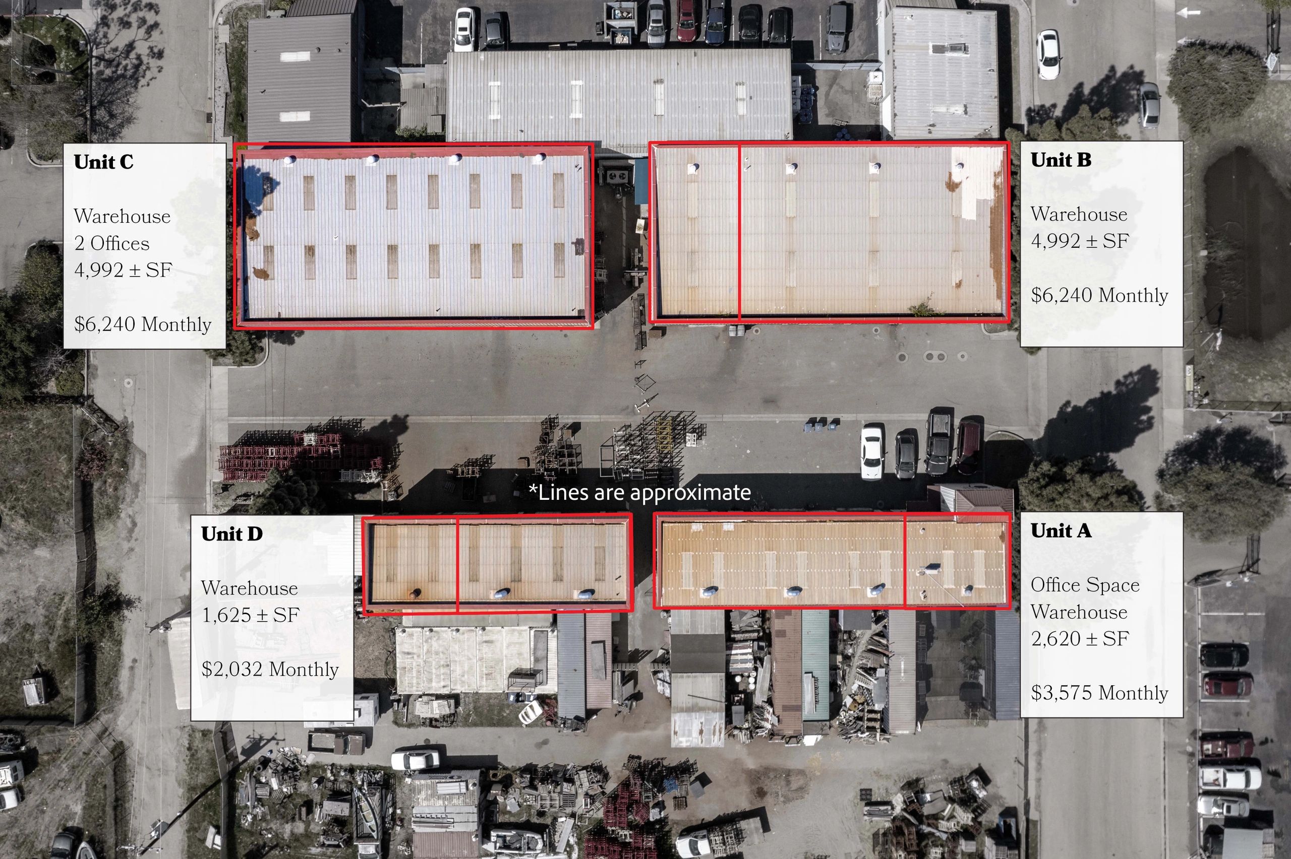 Industrial zoned property for rent offering a mix of warehouse and office configurations as well as storage yard space. Ideal for equipment storage, fabrication, assembly, administrative support, and day-to-day operations. Units may be leased together or separately.
